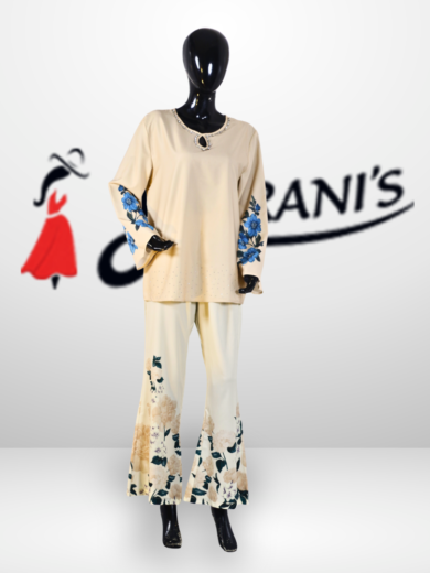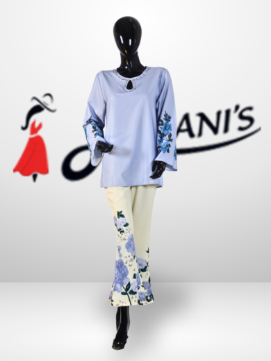 Elegant 2-piece co-ord set featuring a smart collared top with delicate bow details on sleeves and waist, paired with a flowy flared trouser adorned with matching bow accents. Crafted from soft, breathable fabric for all-day comfort, this outfit offers a graceful fall and a modern yet modest look—perfect for casual outings, gatherings, and semi-formal wear.