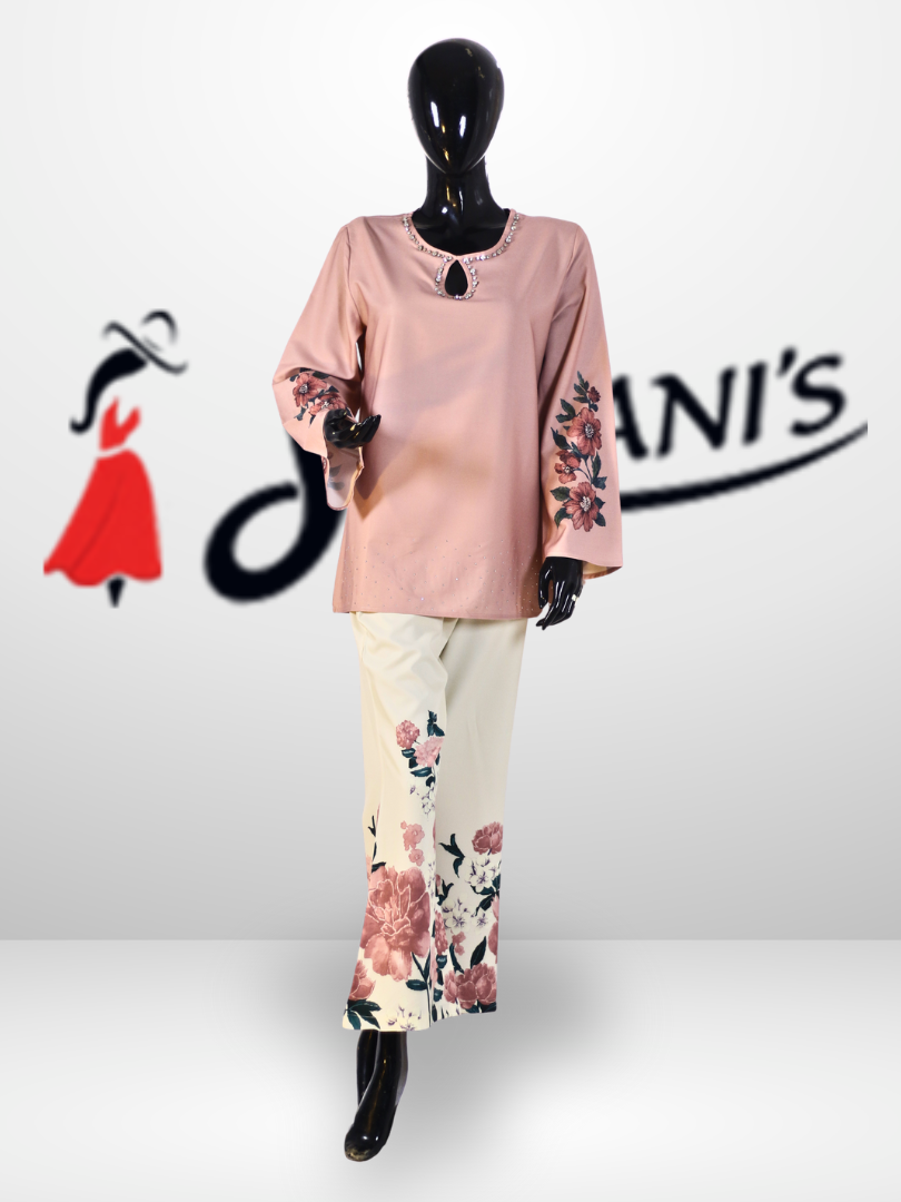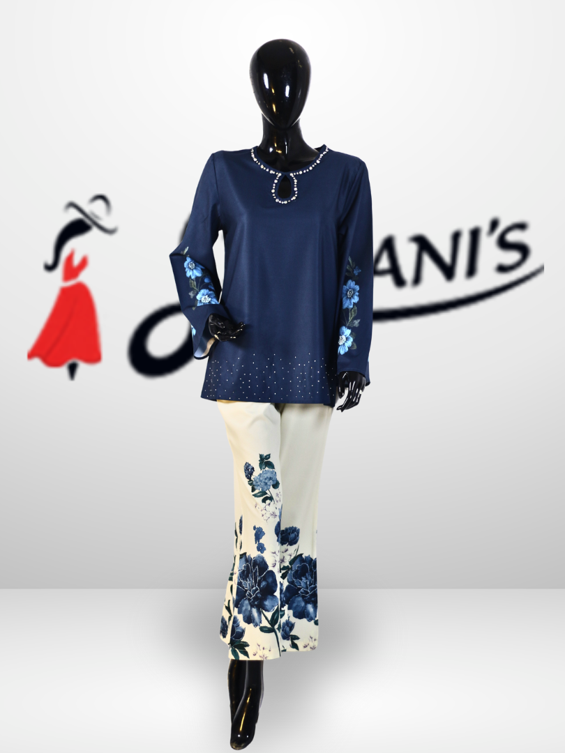 Beige top + Ivory floral trousers, blush Pink top + Cream floral trousers, Mustard top + Ivory floral trousers, Navy Blue top + Cream floral trousers, Sky Blue top + Cream floral trousers
