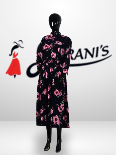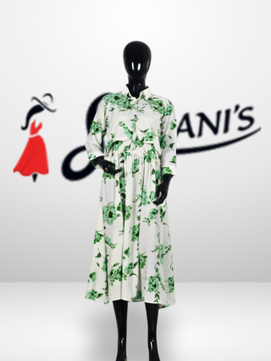 This elegant floral midi dress features a button-down front and a gently gathered waist for a flattering fit. Made from lightweight fabric, it offers comfort and a graceful flow, perfect for casual and semi-formal occasions.
